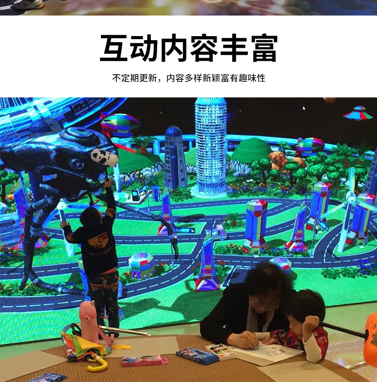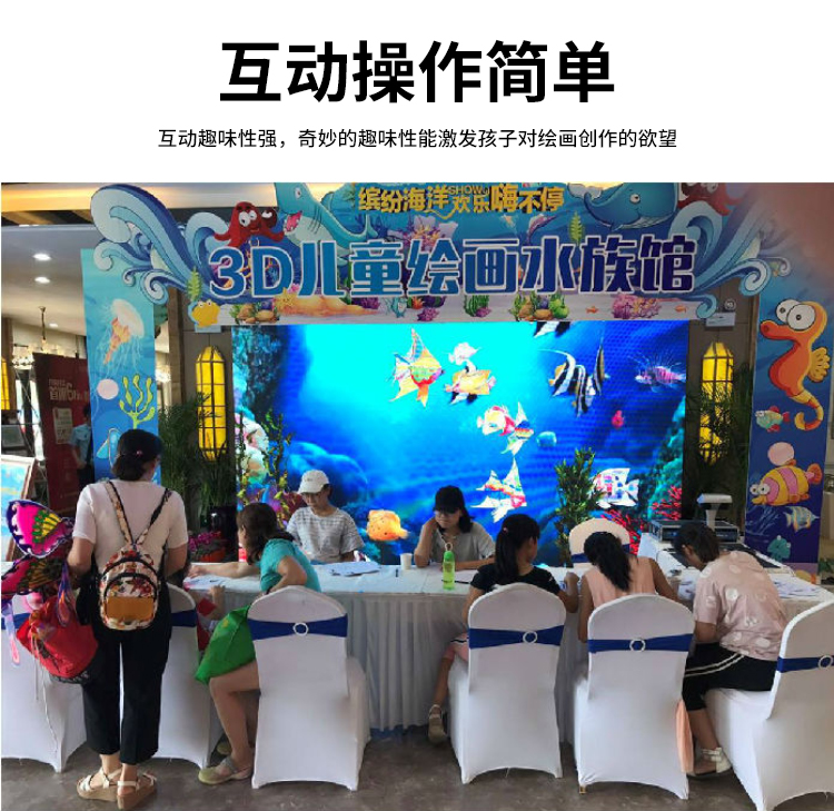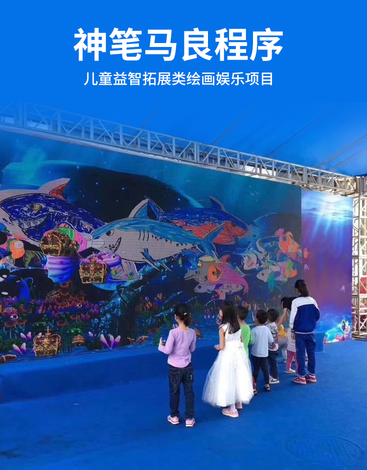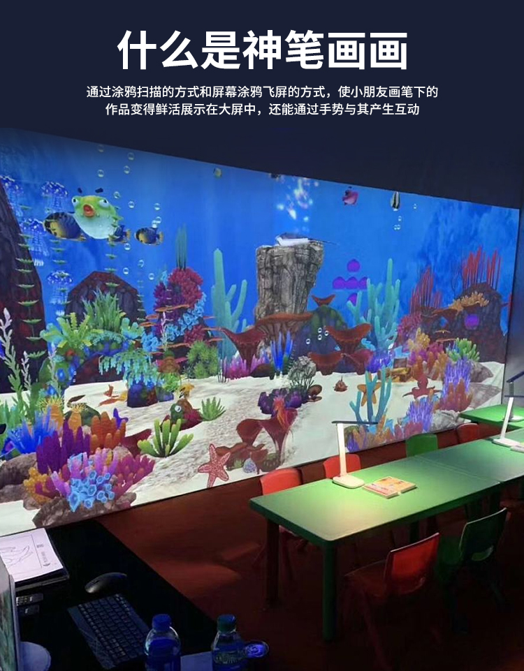 通过涂鸦扫描的方式和屏幕涂鸦飞屏的方式,使小朋友画笔下的作品变得鲜活展示在大屏中,还能通过手势与其产生互动