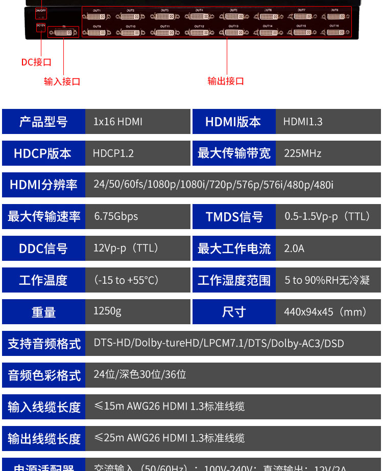 一个电脑主机或其他设备输出 HDMI 音视频信号,16 个显示屏、投影仪等 HDMI 接口设备同时接收展示。