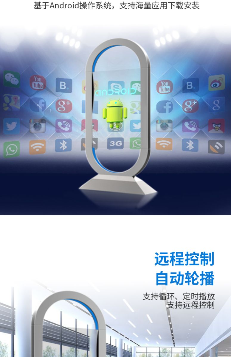 【产品优势】透明屏幕,多点触控,色彩高清艳丽,广告内容循环播放。