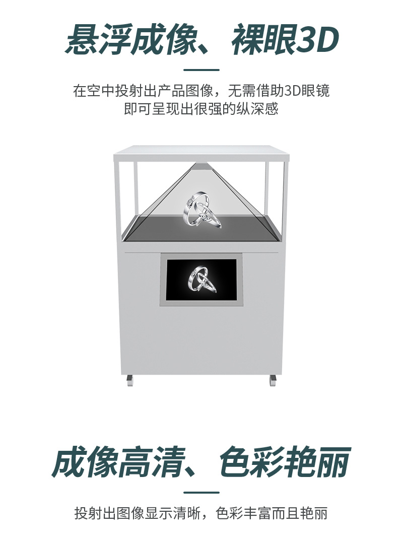 虚幻与现实的结合,裸眼就可以尽情观看奇妙的 3D 立体幻影效果,柜体时尚美观,有科技感;空间成像色彩鲜艳,对比度,清晰度高;具有空间感,透视感。